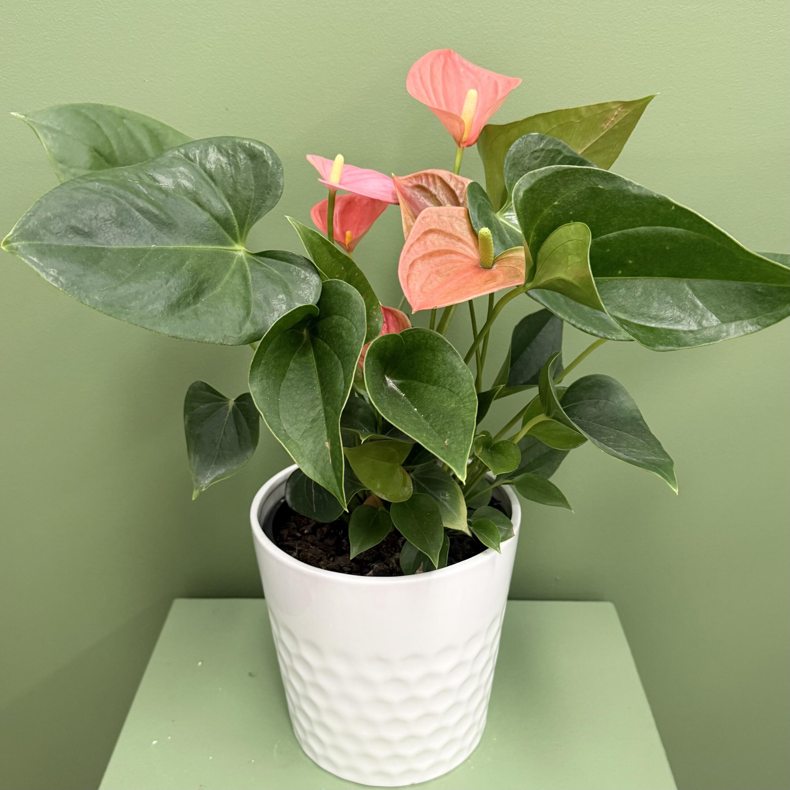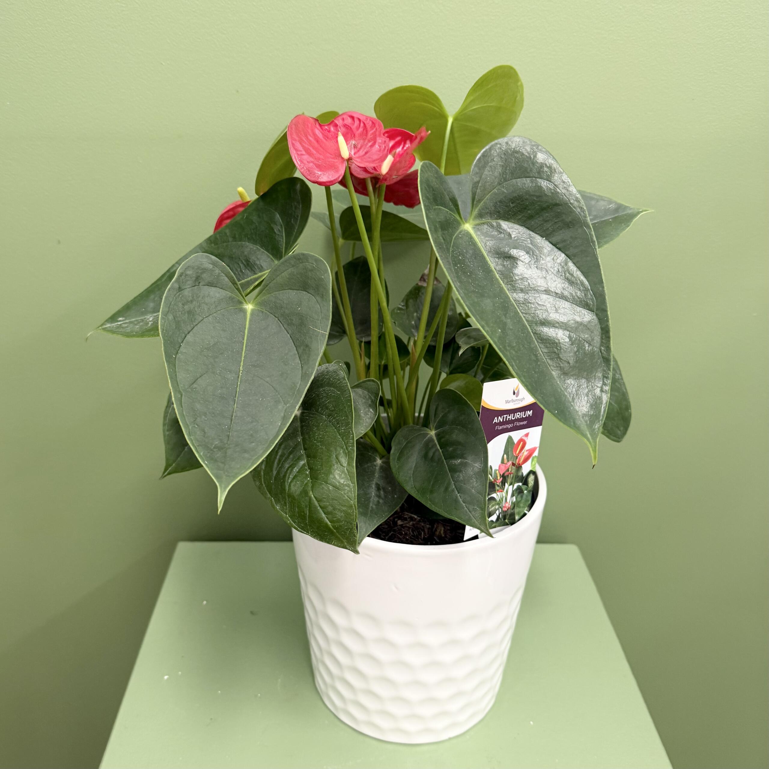 beautiufl large potted anthrium tropical flowering indoor plant displayed in a ceramic pot colours may vary form red ,pink to white a beautiful gift that will flower indoors for months