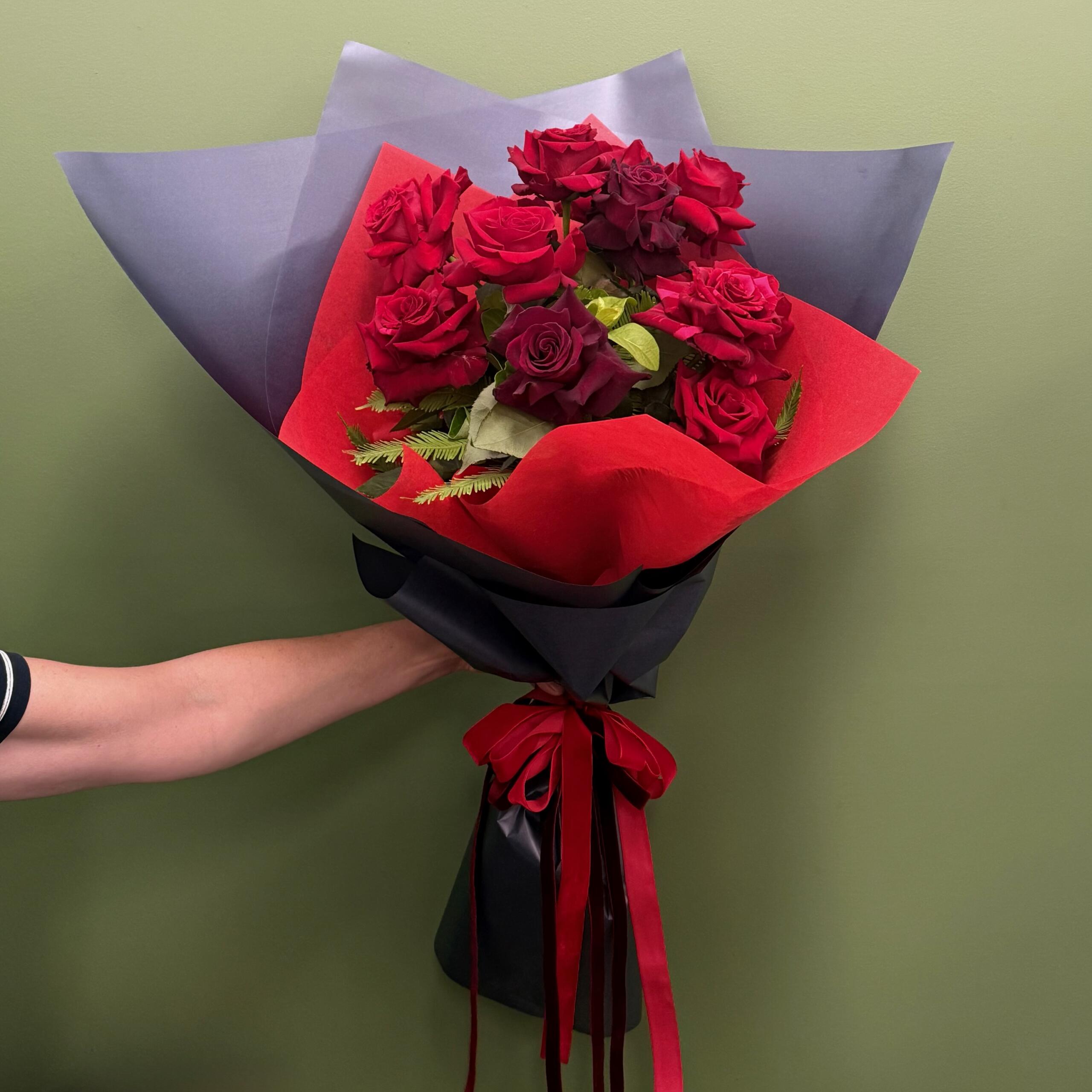 12 stems of premium red and deep red reflected roses and lush greenery, beautifully wrapped with luxe velvet ribons.