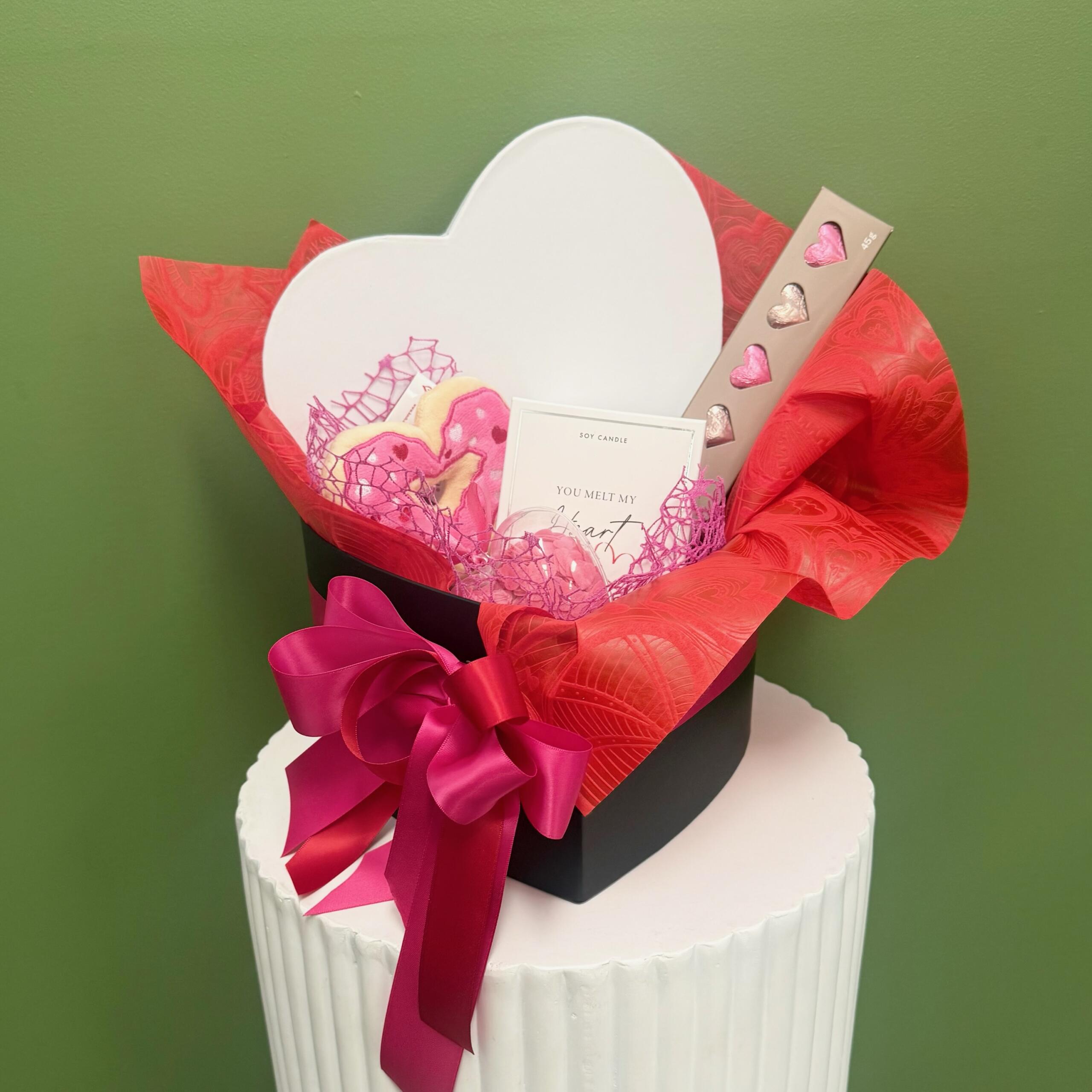 Pamper your love with this beautiful hamper includes scented candle that says ” you melt My heart”, heart shaped bath confetti, milk chocolate hearts and heart donut plush.