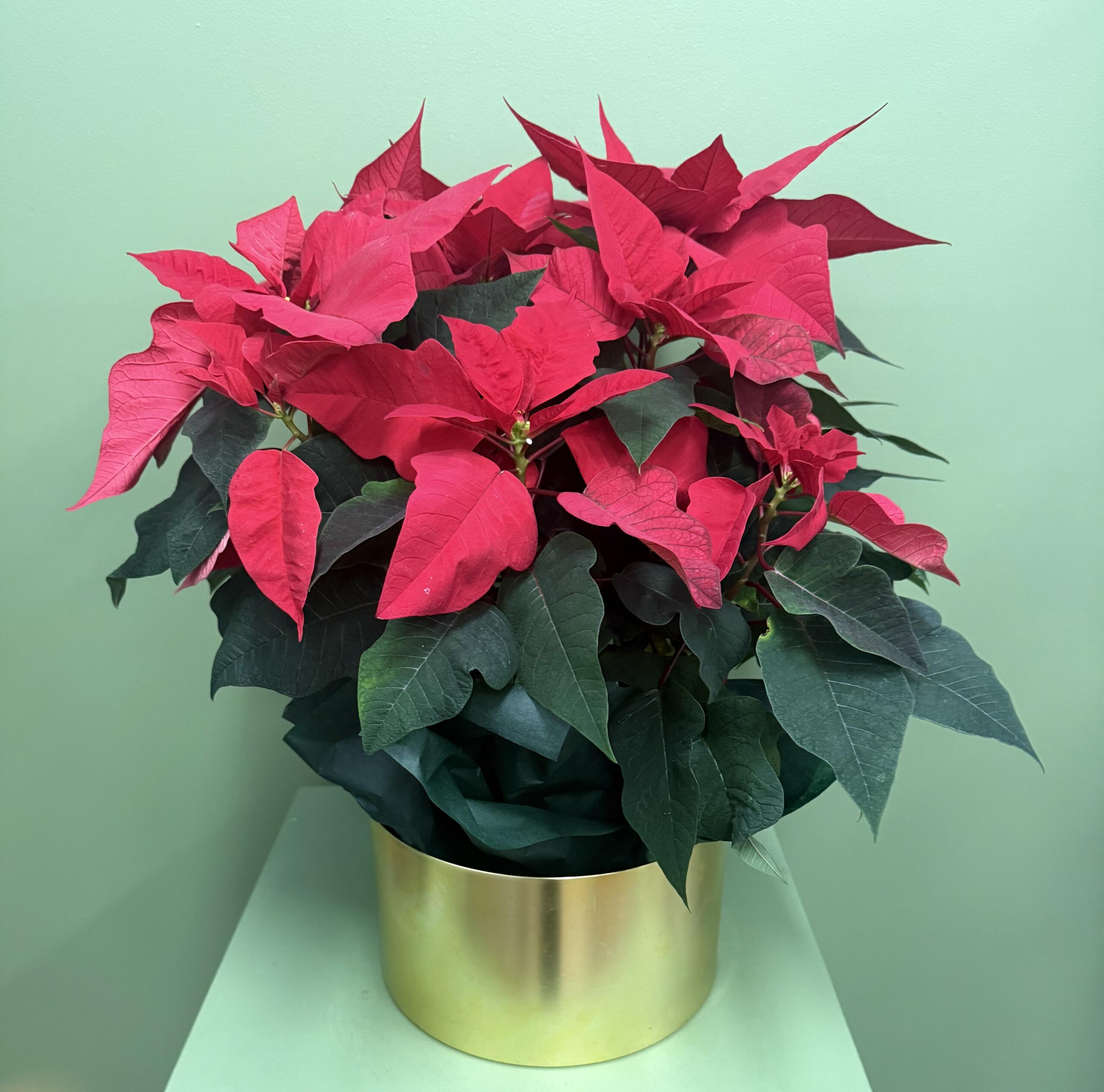 luxe gold potted poitnsettia , long lasting festive plant large in size presented in a gold pot with red ribon for a tradtional christmas gift